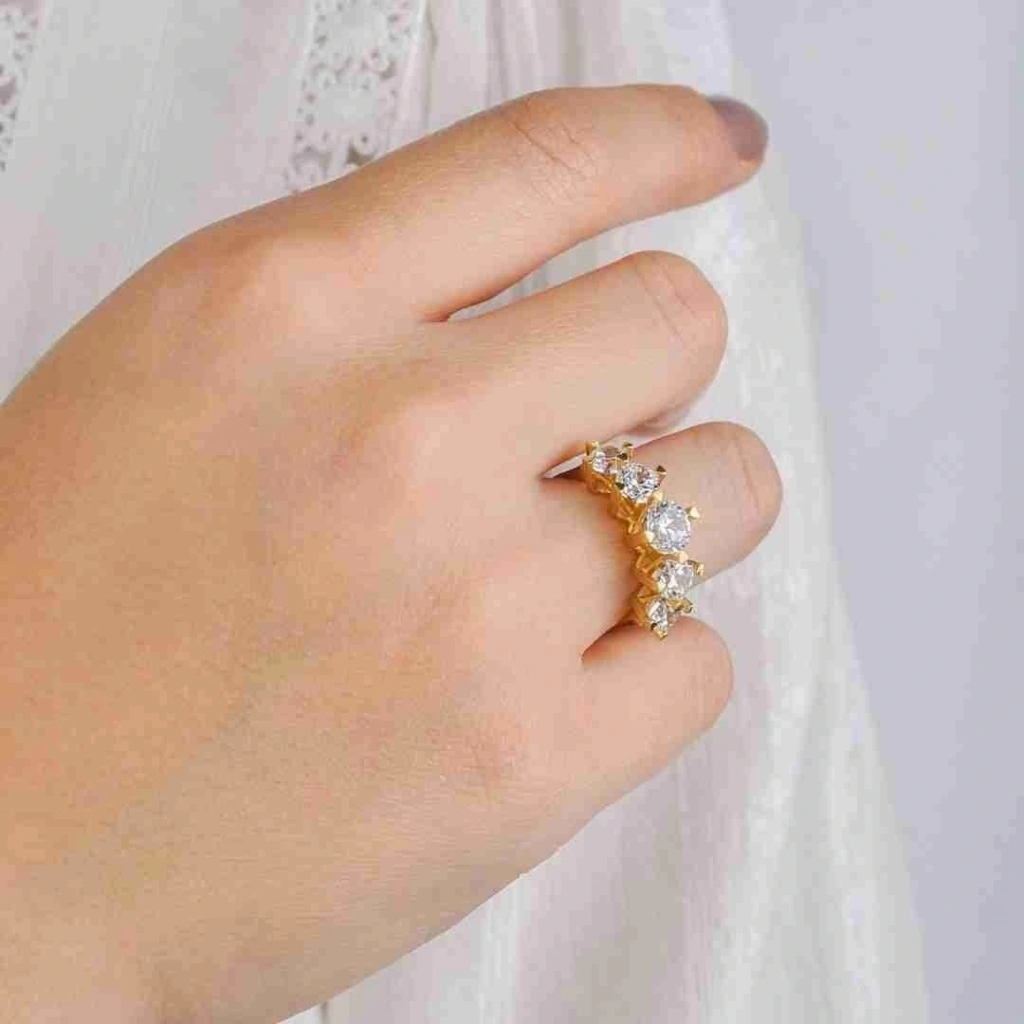 Tasarım: Beştaş tasarımıyla dikkat çeken bu yüzük, klasik ve şık bir görünüm sunar. Beş adet taşın sıralandığı tasarımıyla, yüzüğe göz alıcı bir parlaklık ve ışıltı katmaktadır.