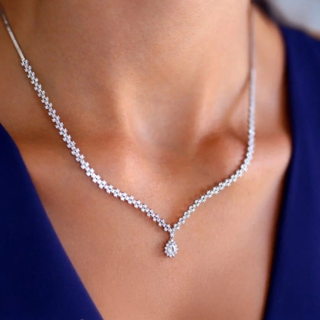 Kolye, 45 cm uzunluğundadır ve damla motifli zincir şeklindedir.