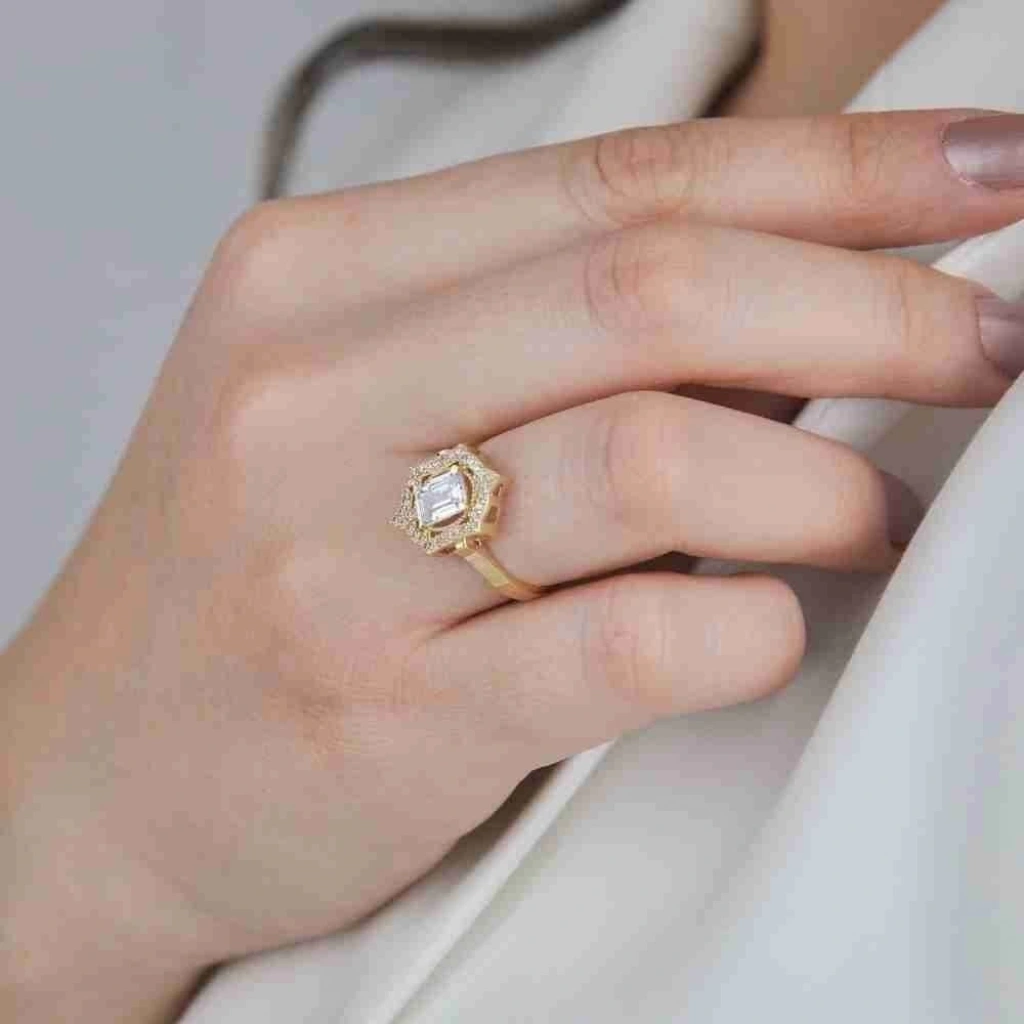 14 Ayar Altın Çerçeveli Baget Yüzük, şıklığı ve zarafeti yansıtan sofistike bir tasarıma sahiptir. 4,85 gram ağırlığındaki bu özel yüzük, zarif çerçeveli baget taşlarıyla dikkat çeker. Altının sıcak parıltısı ve baget taşların estetik uyumu, her bakışta göz kamaştırıcı bir etki yaratır.