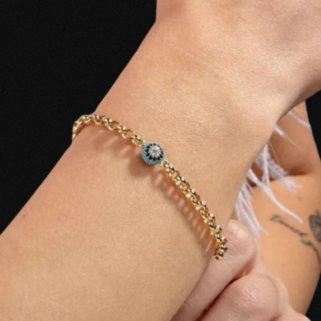 Evla Kuyumculuk'un 14 Ayar Altın Nazarlı Taşlı Bileklik ürünü, zarafet ve korumayı bir arada sunan özel bir mücevherdir.