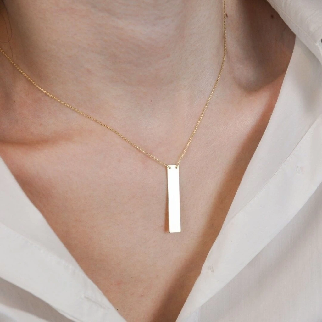Evla Kuyumculuk tarafından özenle üretilen 14 ayar altın piramit plaka kolye, şık ve zarif bir görünüme sahip. Piramit şeklindeki plaka, kolyeye hareket katıyor. Kolye, 14 ayar altından üretilmiştir ve 1,86 gram ağırlığındadır.