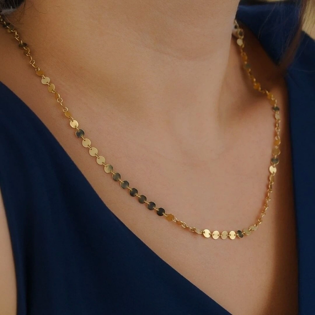 14 Ayar Altın Sık Pullu Zincir, ince ve sık dokusu ile göz alıcı bir koruyanya sahip klasik bir aksesuardır. Özel pullu tasarım, sade zincirlere göre daha dikkat çekici bir durma sergiler. 50 cm uzunluğuyla hem günlük kullanım hem de özel gün kombinlerinize şıklık katar. Zarif tasarımı sayesinde tek başına kullanılabilir ya da diğer takılarla kombinlenebilir.
