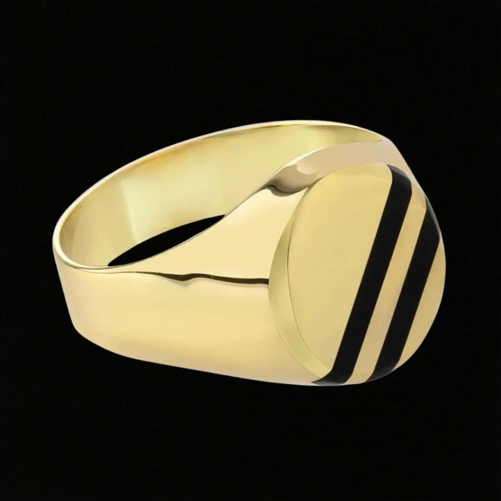 14 Ayar Altın Siyah Çift Şerit Erkek Yüzüğü 3,90 Gram : Bu 14 Ayar Altın Siyah Mühür Erkek Yüzüğü, Evla Kuyumculuk tarafından özenle tasarlanmış ve üretilmiş bir mücevherat ürünüdür. Kaliteli malzemeler ve dikkatli işçilikle yapılan bu yüzük, güçlü ve göz alıcı bir görünüme sahiptir Yüzüğün yapımında 14 ayar altın kullanılmış olup, toplamda 3,90 gram ağırlığındadır. Yüzüğün tasarımında siyah mühür detayları kullanılarak benzersiz bir estetik yakalanmıştır. Altın rengi ve siyahın kontrastı, yüzüğe modern ve sofistike bir hava katarak dikkat çekici bir görünüm sunar.