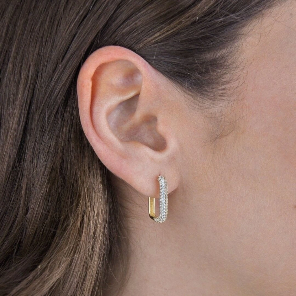 Üç sıra taşlı halka modeli ile dikkat çeken küpe, zarif ve ışıltılı bir görünüme sahip. Vidalı kapama özelliğine sahip küpe, kulakta sağlam bir duruş sergiliyor. Günlük kullanıma uygun olan küpe, uzun yıllar kullanabileceğiniz bir aksesuar.