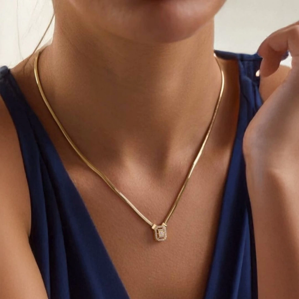 Bu özel tasarım 8 ayar altın balık sırtı zincir kolye, dikkat çekici baget taş detaylarıyla tamamlanmıştır.