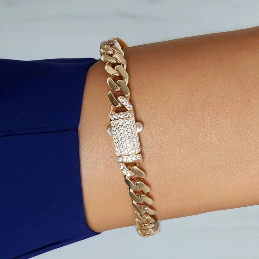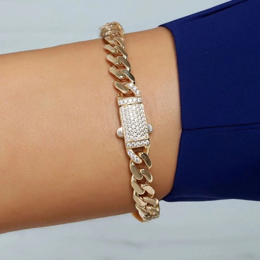 Altın taşlı gurmet bileklik modeli, klasik gurmet zincirin güçlü yapısını zarif taşlarla buluşturarak fark yaratan bir şıklık sunar. 8 ayar altından üretilmiş olan bu özel tasarım, hem günlük kullanımda hem de özel gün kombinlerinde rahatlıkla tercih edilebilir.
