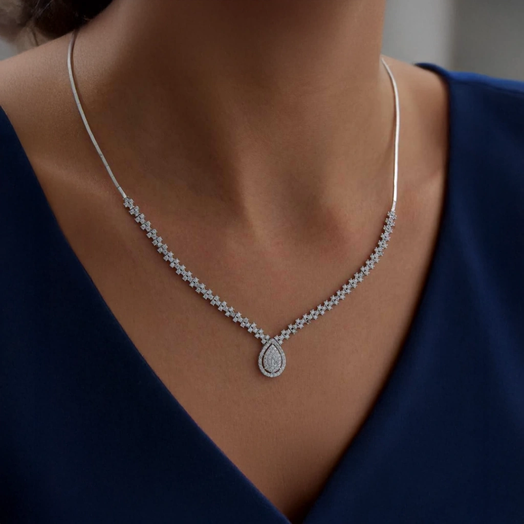 Zarif çizgiler, göz alıcı ışıltı ve şıklığın birleştiği bu özel tasarım Beyaz Altın Damla Set Takımı, modern stilin en etkileyici yansımalarından biridir.