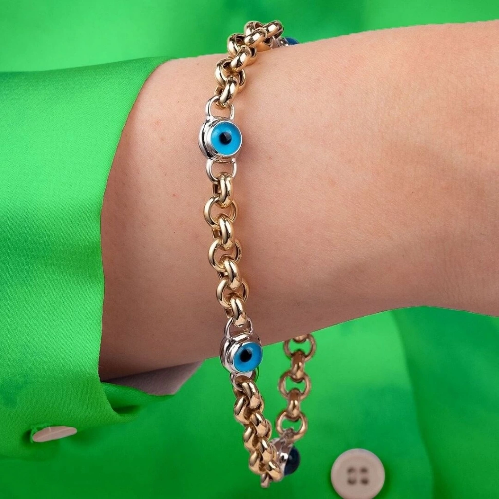 Göz Boncuklu Altın Bileklik detayları, bilekliği farklı kılan ve büyüleyici bir hava katarken aynı zamanda zarafeti ve şıklığı vurgular.
