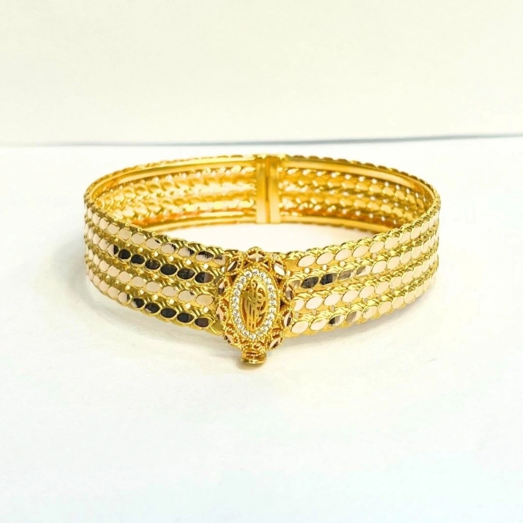 Bu 14 ayar sarı altın 4 sıra pullu tuğralı kelepçe, şık ve zarif bir tasarıma sahiptir. Tuğra motifi ile birleşen pul detayları, bilekliğe modern bir hava katarak dikkat çekici bir aksesuar oluşturur.